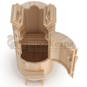 Круглая со скосом. Круглая фитобочка из кедра - это мини парная, которую можно использовать не только в спа-салонах, но и дома. Такая модель наиболее компактна и мобильна. Толщина стенок составляет 25 мм. Фитобочка оборудована откидными створками, дверцей и отверстием для головы. Верхний скос делает положение головы более комфортным и улучшает обзор. Во время парения человек сидит внутри кедровой бочки, а голова находится снаружи. Благодаря этому исключается возможность перегрева. Подлокотники из кедра, встроенные ручки на створках и двери делают эксплуатацию более удобной.